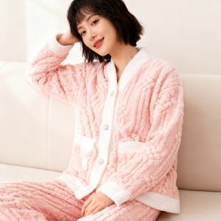 新款睡衣女秋冬季法兰绒加厚V领舒棉绒长袖长裤加绒家